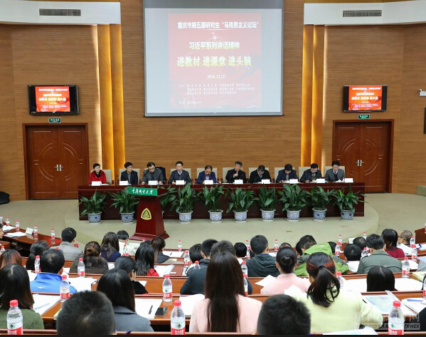 2014年11月22日,重庆市第五届研究生“马克思主义论坛”在重庆邮电大学举行,来自我市10所高校近200名马克思主义学科的研究生及教师代表参会。此次论坛以“习近平总书记系列重要讲话精神进教材、进课堂、进头脑”为主题,由西南大学、91AV