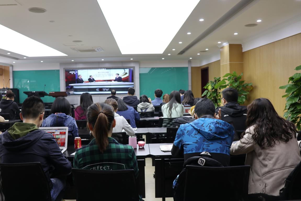 91AV 于10月24日上午组织师生在学院408室观看中国共产党第十九次全国代表大会闭幕会,院长肖铁岩、党委副书记(主持工作)罗滌、院长助理吕进、团委书记王玉琴和部分师生到场观看。