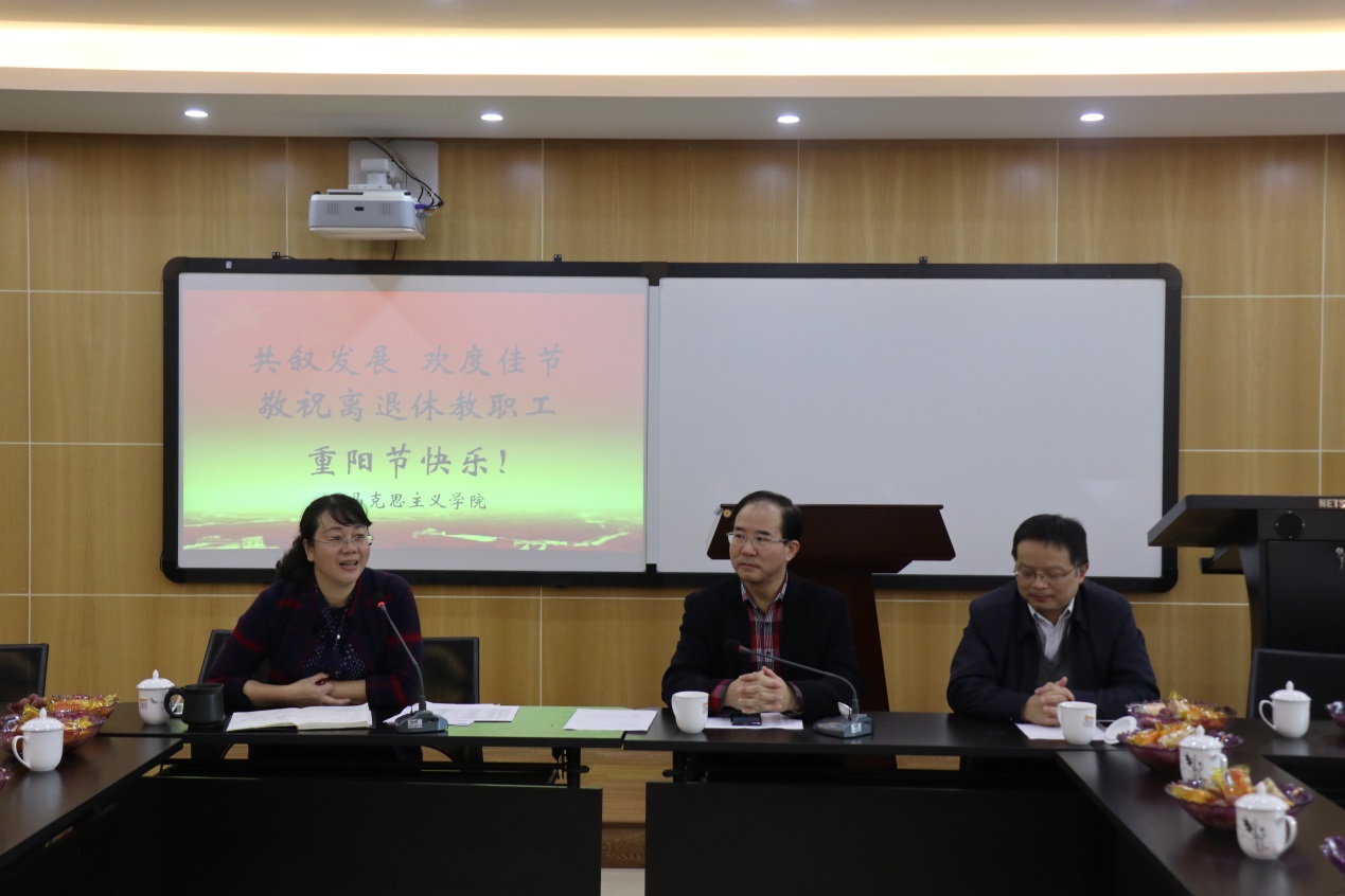 是件大事,对加强学院的学科建设是非常重要的,学院老师的任务艰巨,使命神圣,希望老师们改进教学方法、教学手段和教学模式,让思想政治理论课更有实效性,让学生感到有用、愿意学习并能指导自己的行动”。高燕丽老师代表学院老领导班子对现任领导班子表示问候和肯定,向大家传达了91岁高龄的王佩善老师对学院工作的关心和对大家的祝福。她说,“学院独立运行起步晚,因此一定要加紧工作,一定要努力赶上去,看到新班子有决心,我们也充满了信心。”黄斌老师在发言中表示自己虽然退休了,但是依然很关心十九大,希望能够为学院的发展发挥余热,他希望学院以后要注意处理好科研和教学的关系,将教学、科研有机结合起来。肖先谷老师感谢学院成立不久就召开离退休教职工座谈会,对老同志如此关心与重视,让他很感动;他建议学院要大力引进人才,加强交流,召开全国性马克思主义理论研讨会,提高学院的知名度。岑自信、王达昭、蒋文彬等退休老教师也纷纷对学院发展建言献策。