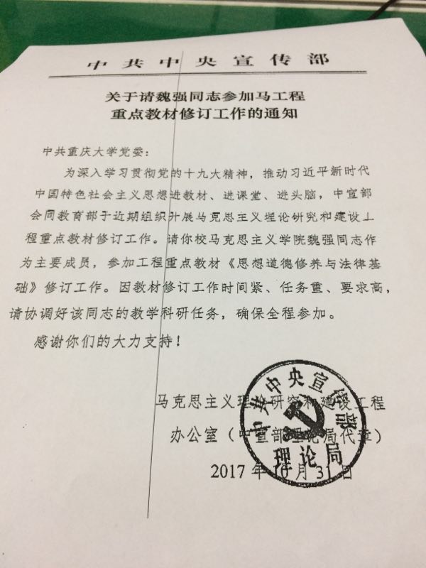 魏强同志作为主要成员,应邀成为工程重点教材《思想道德修养与法律基础(2018年版)》课题组主要成员,这是我校教师首次入选中央“马工程”重点教材课题组主要成员。此次,所有重庆高校入选中央“马工程”重点教材课题组主要成员只有两位,我校魏强同志是其中一位。
