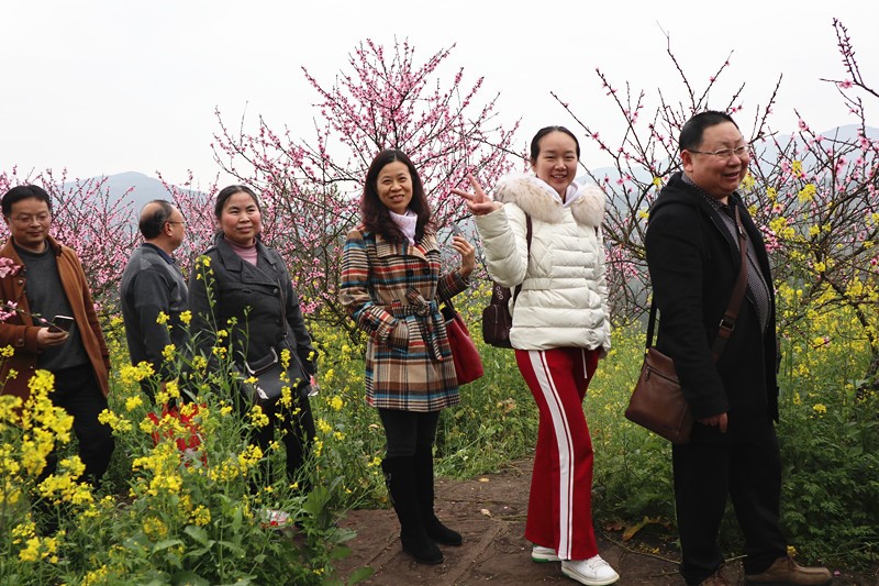 一到九凤山脚下,老师们就看见整洁肃穆的村委会,错落有致的村庄,环山的马路,路边大气的农业园区,展现了都市生态农业的美好图景。放眼望去,山上满是桃花、李花、梨花、油菜花......,微风吹来,香气沁人心脾。各种树的新芽在春风中努力生长,小草嫩嫩的,绿绿的,让人感受到勃勃的生机与活力。老师们在花丛中结伴而行,不时用手机和相机拍下美景与美人,欢声笑语一路挥洒。