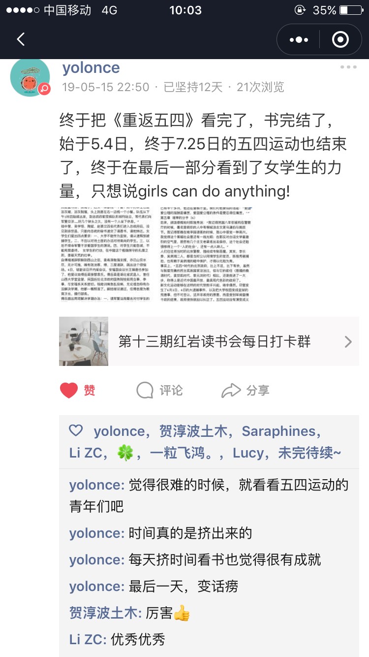线上活动“十二天打卡计划”于2019年5月4日至5月15日展开,报名参与“五四青年悦读会”的同学在推荐书目中择取感兴趣的书籍,通过微信小程序——“小打卡”组成阅读圈,进行每日打卡,留言、评论分享读书感悟。