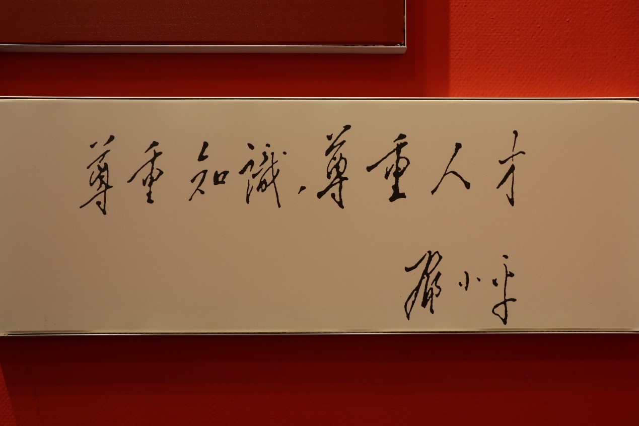 顺着主游道一路往前,我们来到以“我是中国人民的儿子”为主题的邓小平故居陈列馆。馆前红底黄字写着的“庆祝改革开放四十周年(邓小平与改革开放展)春天的故事”,耀眼庄严;陈列馆共收集了有关邓小平同志的408幅图片、170件文物、200多件档案文献资料,通过声、光、电等高科技手段,生动形象地展现了邓小平同志为中国革命、建设和改革事业不懈奋斗的光辉一生。其中,小平同志留法勤工俭学时的工卡、邓小平50年代使用过的印章、毛泽东评价邓小平的手稿、小平1979年访美时美国朋友赠送的牛仔帽、国庆35周年的检阅车、邓小平参加国务活动和视察南方时穿过的服装等许多见证重要历史时刻的文物带领着我们穿越时空与“小平”再次相遇。镌刻在石墙上的“我是中国人民的儿子,我深情地爱着我的祖国和人民。”、“尊重知识,尊重人才”等一字一句不仅深深刻在邓小平的内心深处,也启示着我们要不忘嘱托,勇往直前。