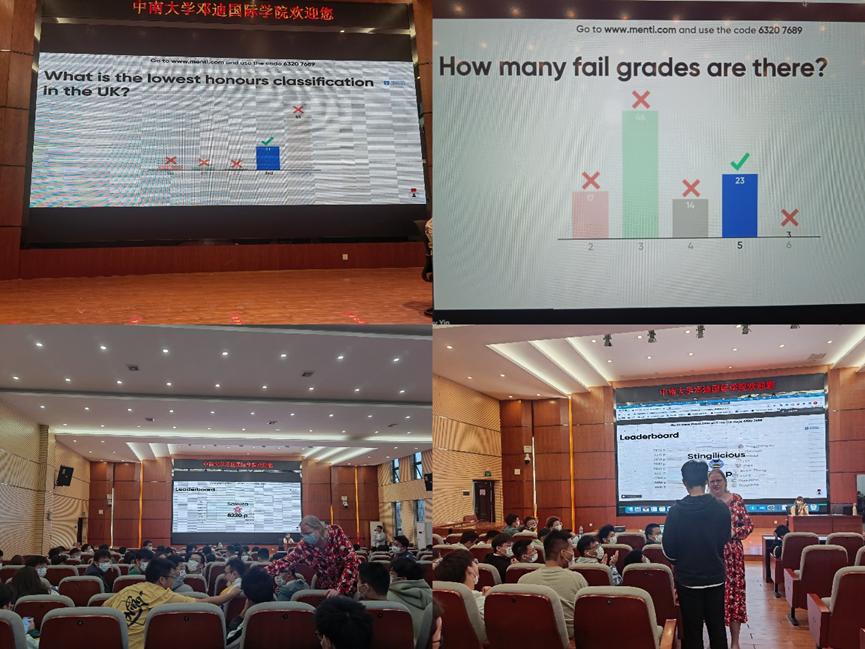 针对邓迪大学荣誉学位制度和评分体系,Karen Petrie进行了详细讲解,并通过Mentimeter互动平台进行了现场测验。很多同学答错了“英国体系内最低的荣誉学位是什么”和“不及格有几档”两个问题,现场一片哗然。得分最高的两名同学获得了一份苏格兰小礼品。
