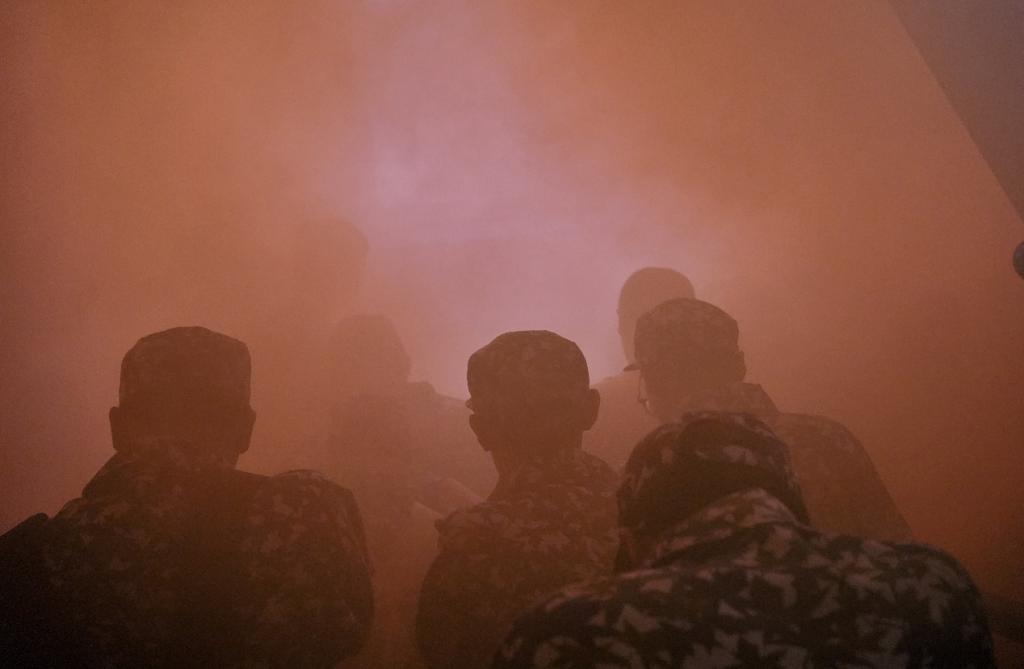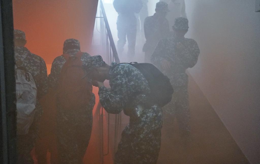 面对楼道中弥漫的阵阵浓烟,全体学生沉着冷静且动作迅速,用湿毛巾捂住口鼻,在各班军训负责人的指挥下井然有序地弯腰冲出“火灾现场”,疏散到安全的开阔地带,快速高效地完成了撤离。