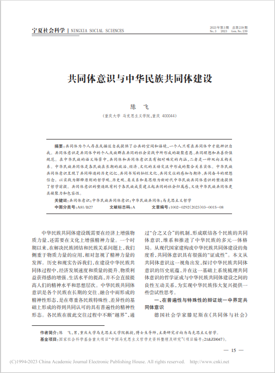 陈飞教授在CSSCI核心期刊《宁夏社会科学》上发表论文《共同体意识与中华民族共同体建设》