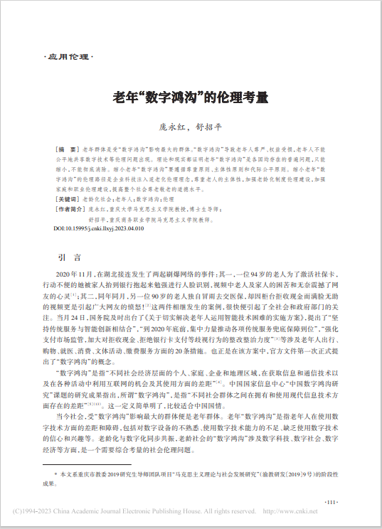 庞永红教授在CSSCI核心期刊《伦理学研究》上发表论文《老年“数字鸿沟”的伦理考量》