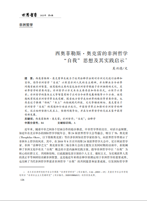 吴兴德副教授在CSSCI核心期刊《世界哲学》上发表论文《西奥菲勒斯·奥克雷的非洲哲学“自我”思想及其实践启示》