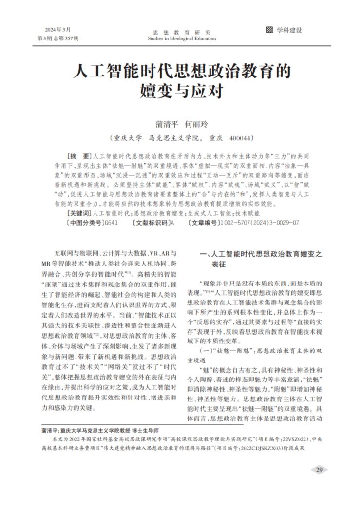 蒲清平教授在CSSCI核心期刊《思想教育研究》上发表论文:《人工智能时代思想政治教育的嬗变与应对》