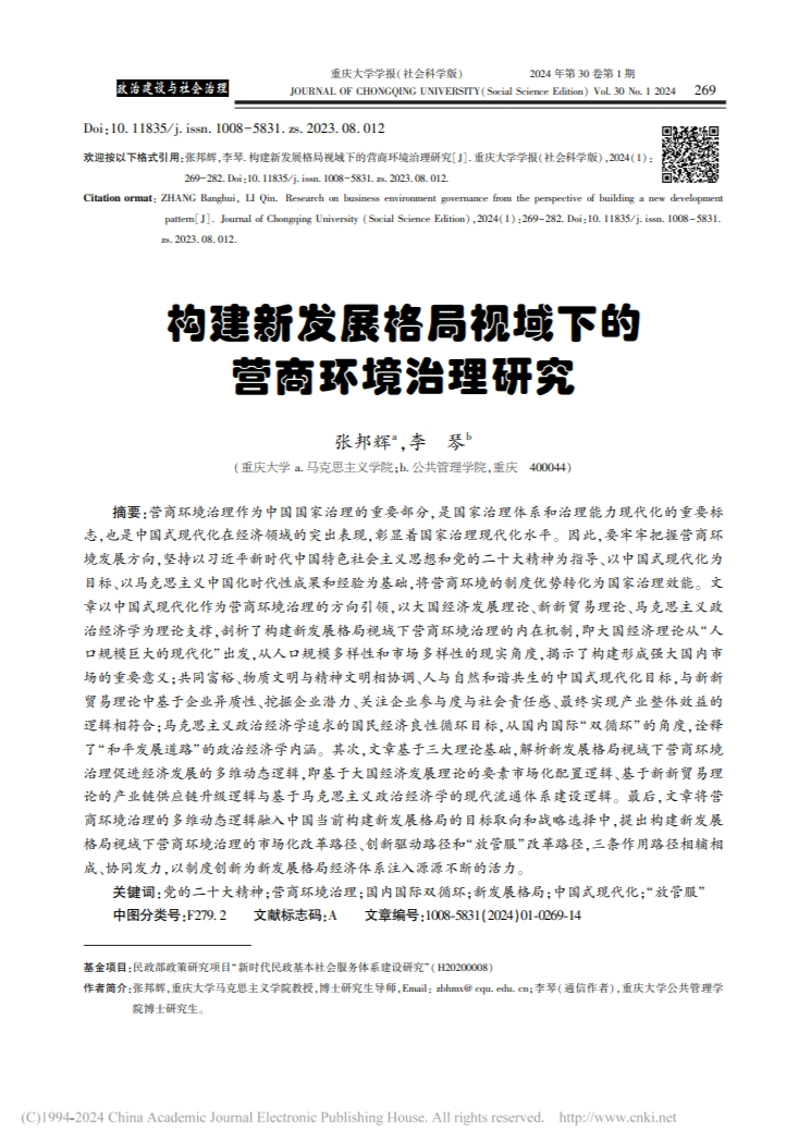 营商环境治理作为中国国家治理的重要部分,是国家治理体系和治理能力现代化的重要标志,也是中国式现代化在经济领域的突出表现,彰显着国家治理现代化水平。因此,要牢牢把握营商环境发展方向,坚持以习近平新时代中国特色社会主义思想和党的二十大精神为指导、以中国式现代化为目标、以马克思主义中国化时代化成果和经验为基础,将营商环境的制度优势转化为国家治理效能。文章以中国式现代化作为营商环境治理的方向引领,以大国经济发展理论、新新贸易理论、马克思主义政治经济学为理论支撑,剖析了构建新发展格局视域下营商环境治理的内在机制,即大国经济理论从“人口规模巨大的现代化”出发,从人口规模多样性和市场多样性的现实角度,揭示了构建形成强大国内市场的重要意义;共同富裕、物质文明与精神文明相协调、人与自然和谐共生的中国式现代化目标,与新新贸易理论中基于企业异质性、挖掘企业潜力、关注企业参与度与社会责任感、最终实现产业整体效益的逻辑相符合;马克思主义政治经济学追求的国民经济良性循环目标,从国内国际“双循环”的角度,诠释了“和平发展道路”的政治经济学内涵。其次,文章基于三大理论基础,解析新发展格局视域下营商环境治理促进经济发展的多维动态逻辑,即基于大国经济发展理论的要素市场化配置逻辑、基于新新贸易理论的产业链供应链升级逻辑与基于马克思主义政治经济学的现代流通体系建设逻辑。最后,文章将营商环境治理的多维动态逻辑融入中国当前构建新发展格局的目标取向和战略选择中,提出构建新发展格局视域下营商环境治理的市场化改革路径、创新驱动路径和“放管服”改革路径,三条作用路径相辅相成、协同发力,以制度创新为新发展格局经济体系注入源源不断的活力。