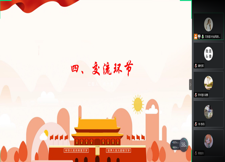 研团委学生会组织部、实践部、宣传部、新媒体运营中心、学术部和文体部的部门代表依次就本学期的部门工作进行了前期工作总结和后期工作安排。其中,新媒体运营中心的李梅同学表示,疫情期间,新媒体接续推送“一周新闻汇”,已经上线78期,部门必将在未来的工作中,持续探索线上隔屏互动的学生活动新模式,加强校级马院之间的学习。同学们也一致表示,本学期工作因疫情影响,线上活动中现实存在的隔屏互动、活动实效等问题考验着每位成员,但是在同学们通力协作和不断尝试下,完满地举办了各类活动。