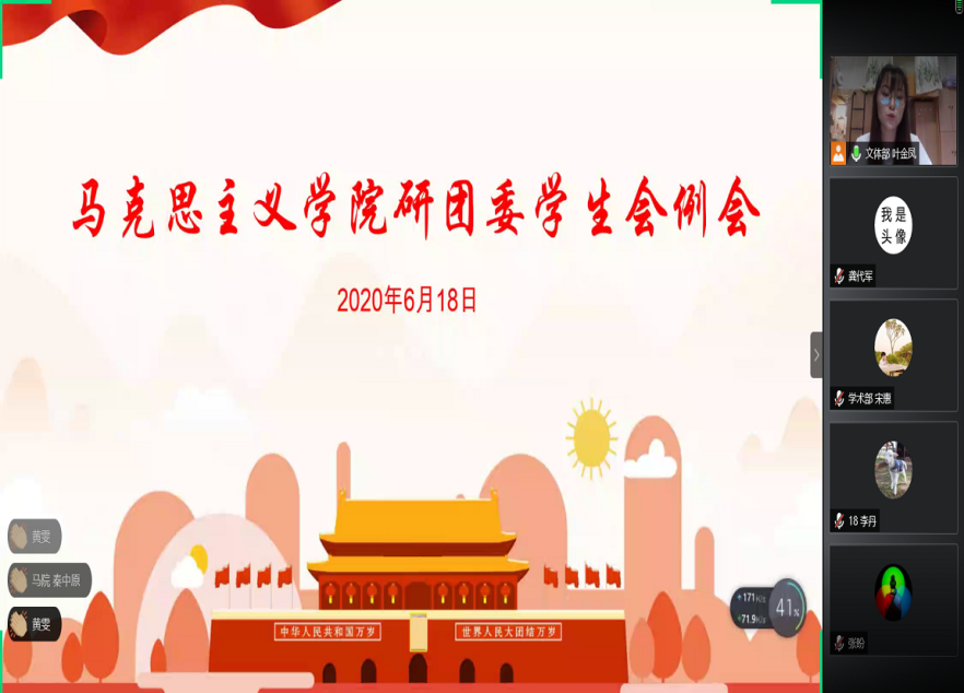研团委学生会2020年春季第一次全体例会在“腾讯会议”举行,研团委学生会全体成员参会,会议由研团委学生会文体部副部长叶金凤主持。