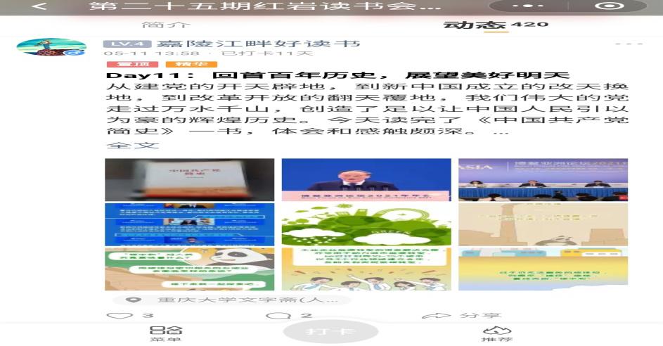 线上活动“十二天打卡计划”于2021年5月1日至5月12日展开,报名参与本次活动的同学在推荐书目及影视作品中选取感兴趣的书影,坚持在微信小程序——“小打卡”组成的阅读圈里打卡12天,通过分享读书或观影体会,追忆中国共产党波澜壮阔的百年风雨路。本次打卡活动吸引了中山大学、西南大学、东南大学等多所高校的研究生参与,同学们参与热忱非常高。