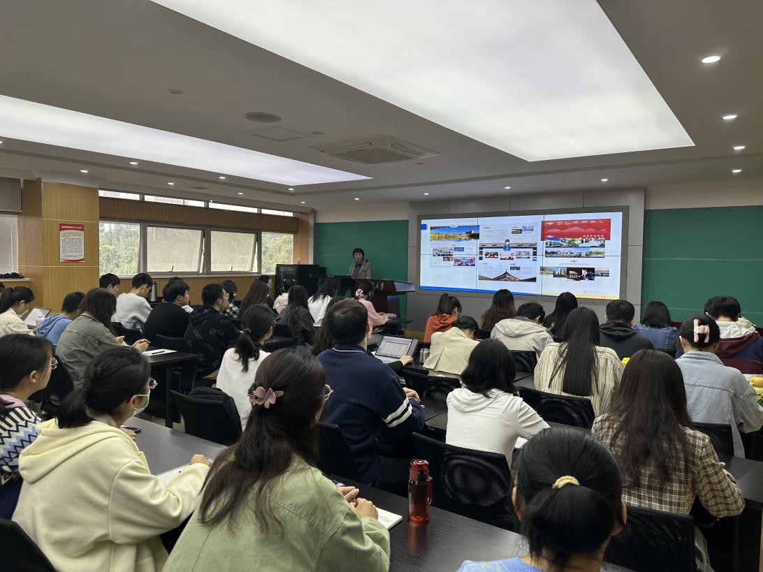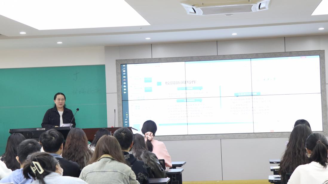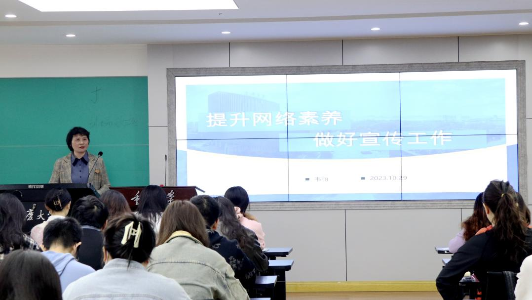 韦丽阐述了新时代新闻宣传工作的新作为。她谈到,在新时代新征程背景之下,宣传思想文化工作面临新形势、新任务,新闻宣传从业人员必须要有新的气象、新的作为,自觉承担起举旗帜、聚民心、育新人、兴文化、展形象的使命任务。她强调作为校园新闻从业者,需要不断提高媒介素养,既要满足受众新闻需求,也要具备新闻价值判断的能力,更要正确引导舆论导向。