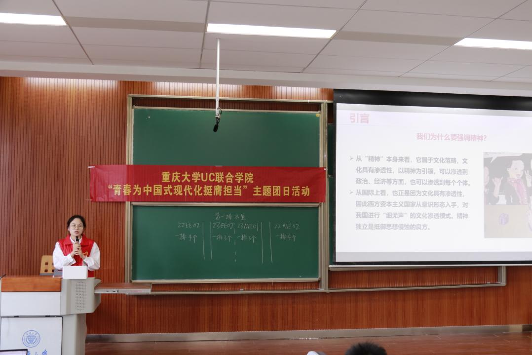 马克思主义“延安风·红岩韵”宣讲团受邀参加UC联合学院在虎溪校区第一教学楼334室举办的“青春为中国式现代化挺膺担当”主题团日活动。主讲人杨阳作了题为“把延安精神传承下去”的主题宣讲,UC联合学院22级电气2班、22级机械1班、23级电气2班、23级机械2班全体团支部成员积极参与此活动。