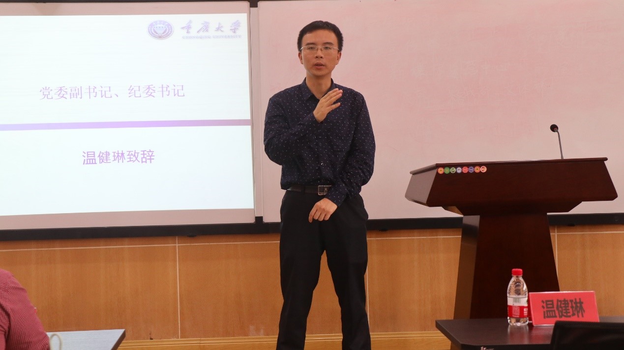 温健琳副书记代表学院领导在成立大会上致辞,对过去一年为学院辛苦工作的同学们表示衷心感谢,对新进干事表示热烈欢迎。希望同学们在未来的三年里,不忘学习初心,不负服务使命!