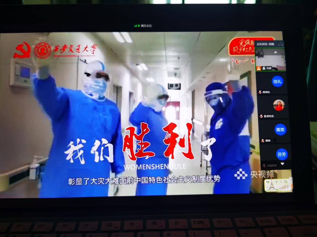本次主题党日活动共两项重要议程,第一个议程是组织教研室全体党员在线集中观看由中国人民大学、北京科技大学、复旦大学、西安交通大学四校联合开讲的“七一”专题之高校党组织战“疫”示范微党课。