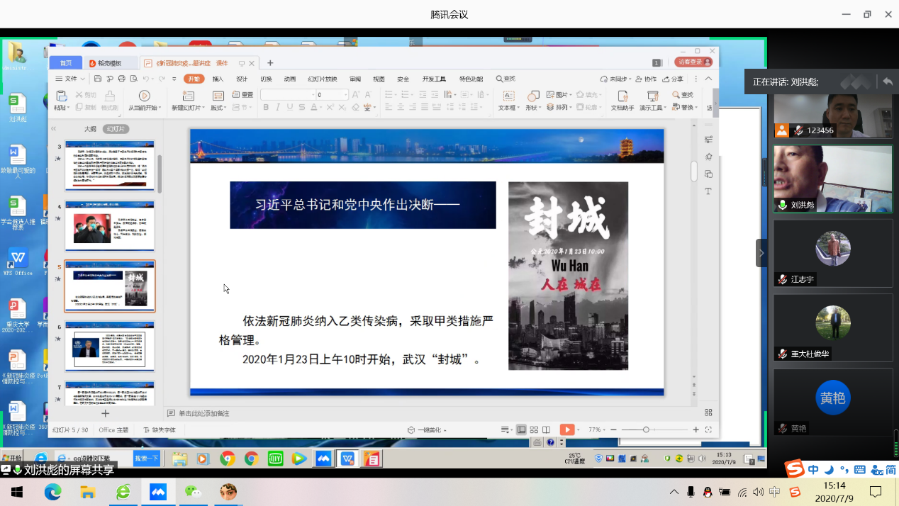 2020年7月9日下午,中国近现代史纲要教研室教师党支部以“讲战疫故事 悟初心使命”为主要内容召开了一次专题组织生活会。教师党员刘洪彪教授结合疫情期间的生动事例和鲜活人物故事为全体党员讲了一堂题为《新冠肺炎疫情防控彰显了党的集中统一领导的制度优势》的主题党课。党课结束后,各位党员同志结合疫情期间的身边人、身边事,谈切身体会、悟入党初心。