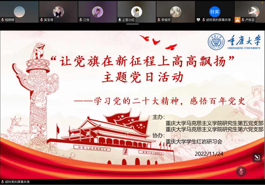 研究生五、六支部与学生红岩研习会联合开展的“让党旗在新征程上高高飘扬”主题党日活动,本次活动以同志们喜闻乐见的方式进行了正能量的主题宣讲和趣味性的知识竞赛,在疫情防控这个特殊时刻,这不仅缓解了同志们的身心压力,调动了同志们的积极性和参与感,而且丰富了同志们的校园文化生活。通过本次活动我更加深刻地学习和领悟了党的二十大精神和党的百年征程,深感作为新时代的青年党员责任重大,我们要练好内功、提升修养、增强本领,努力成为可堪大用、能担重任的栋梁之才,不辜负党和人民期望和重托!