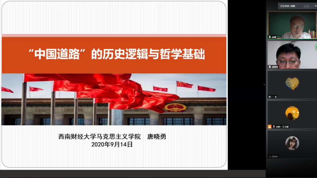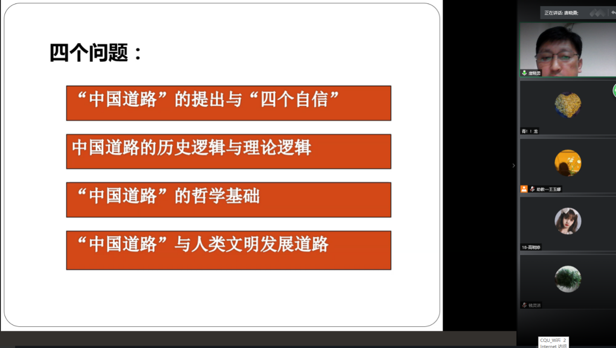 唐晓勇教授围绕四个问题对“中国道路”的历史逻辑和哲学基础做了深刻阐释。讲座中,唐教授围绕辩证唯物论基础和唯物辩证法基础以及唯物史观来阐述了“中国道路”的哲学基础,他指出中国道路是符合中国国情和历史发展规律的必然选择;他以新冠疫情防控斗争为例指出不同国家之间要相互尊重,坚持“共同抗疫”,协作抗疫,也要根据各自国家情况,采取符合自身特点的有力举措和保障。