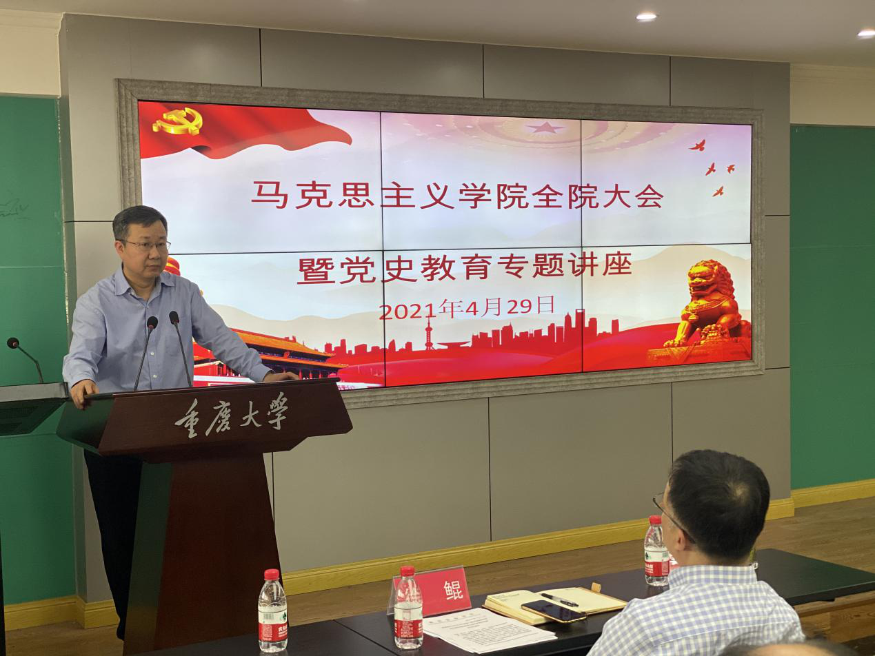 2021年4月29日下午,学院在408教室召开全院大会暨党史教育专题讲座,邀请刘洪彪教授进行专题讲座,学院党委书记罗滌、院长张邦辉、党委副书记温健琳、副院长徐鲲、全体教职工参加会议。