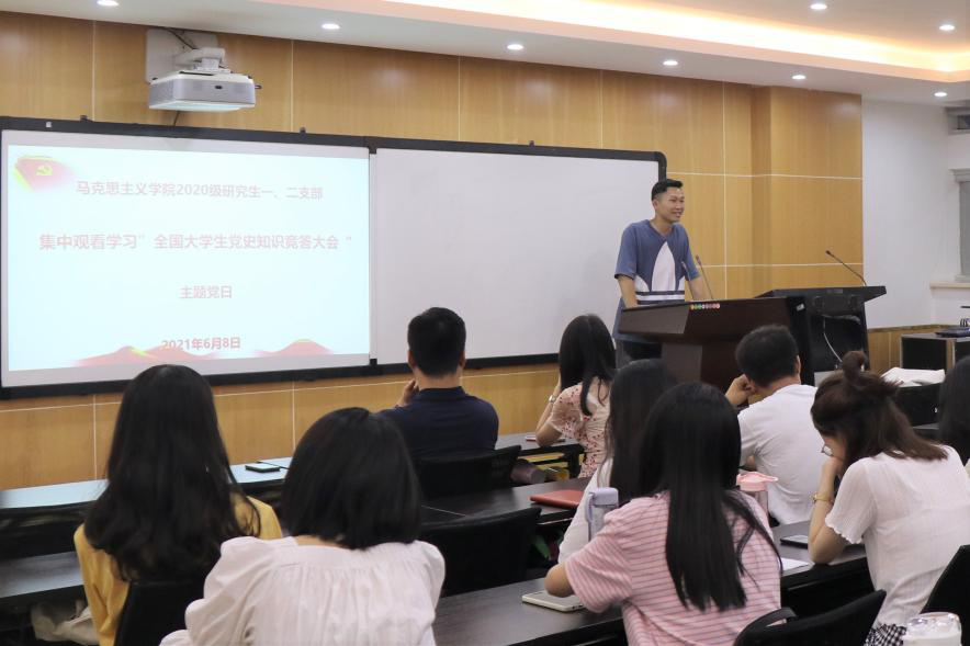 2020级研究生一、二支部在学院412室集中观看学习《全国大学生党史知识竞答大会》。《全国大学生党史知识竞答大会》是由中央广播电视总台策划发起的学党史类节目。节目以演播室现场百人团、全国2800多所高校大学生的线上线下互动,开展党史知识竞答。我院2020级研究生雷洪鸣作为91AV