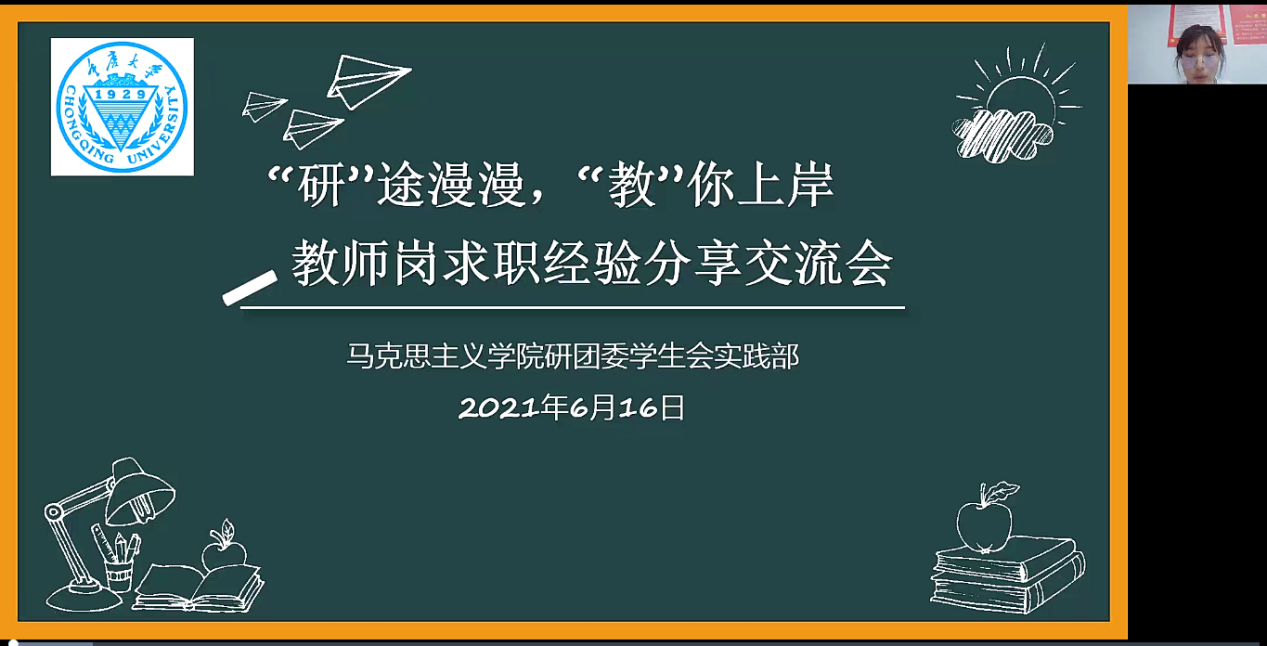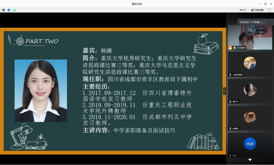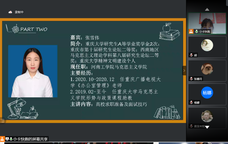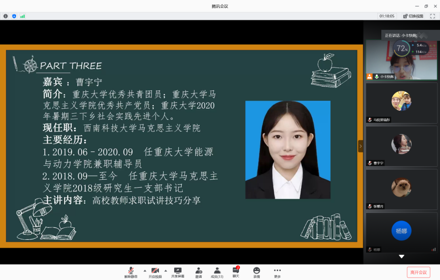 在“腾讯会议”上举行了教师岗求职经验在线分享会。本次交流会邀请了学院成功考上教师岗位的的赵兰、杨娜、曹宇宁、张雪伟4位2021届毕业研究生进行经验分享。