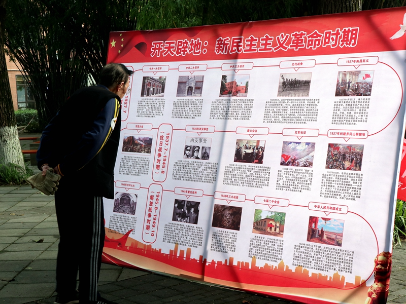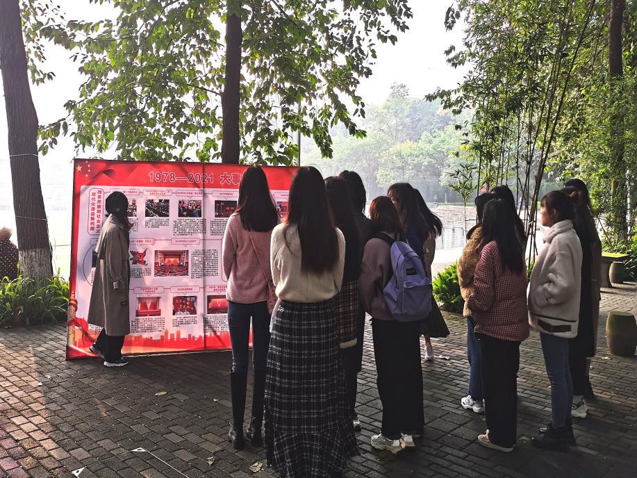 宣讲团成员的带领下,参观学习了“开天辟地:新民主主义革命时期”与“1978-2021大事记”两大主题图鉴,从中了解了中国共产党百年奋斗的红色故事以及蕴含的红船精神、长征精神、红岩精神等革命精神。一名退休教师在参与展览活动后表示,“历史证明了中国共产党的领导是正确的,中国特色社会主义道路是正确的,你们年轻人要以史为鉴,永远跟党走。”