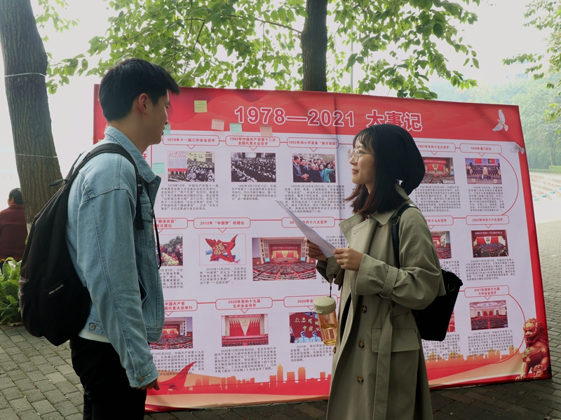 本次主题展览活动以建党百年的历史成就为主线,集中展示了中国共产党自1921年以来发生的重大历史事件以及其中涌现出的伟大精神。通过宣讲党史故事、分发宣传手册、开展党史知识竞答等形式,向重大师生展现了中国共产党带领中华民族实现伟大复兴的奋斗历程。