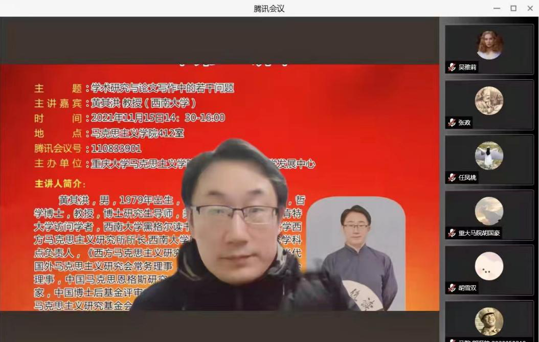 举行第二十七讲“红岩讲坛”活动,西南大学黄其洪教授以“学术研究与论文写作中的若干问题”为主题作了学术讲座。本次讲座采用线上腾讯会议、线下课堂讲座的方式同步进行,讲座由91AV