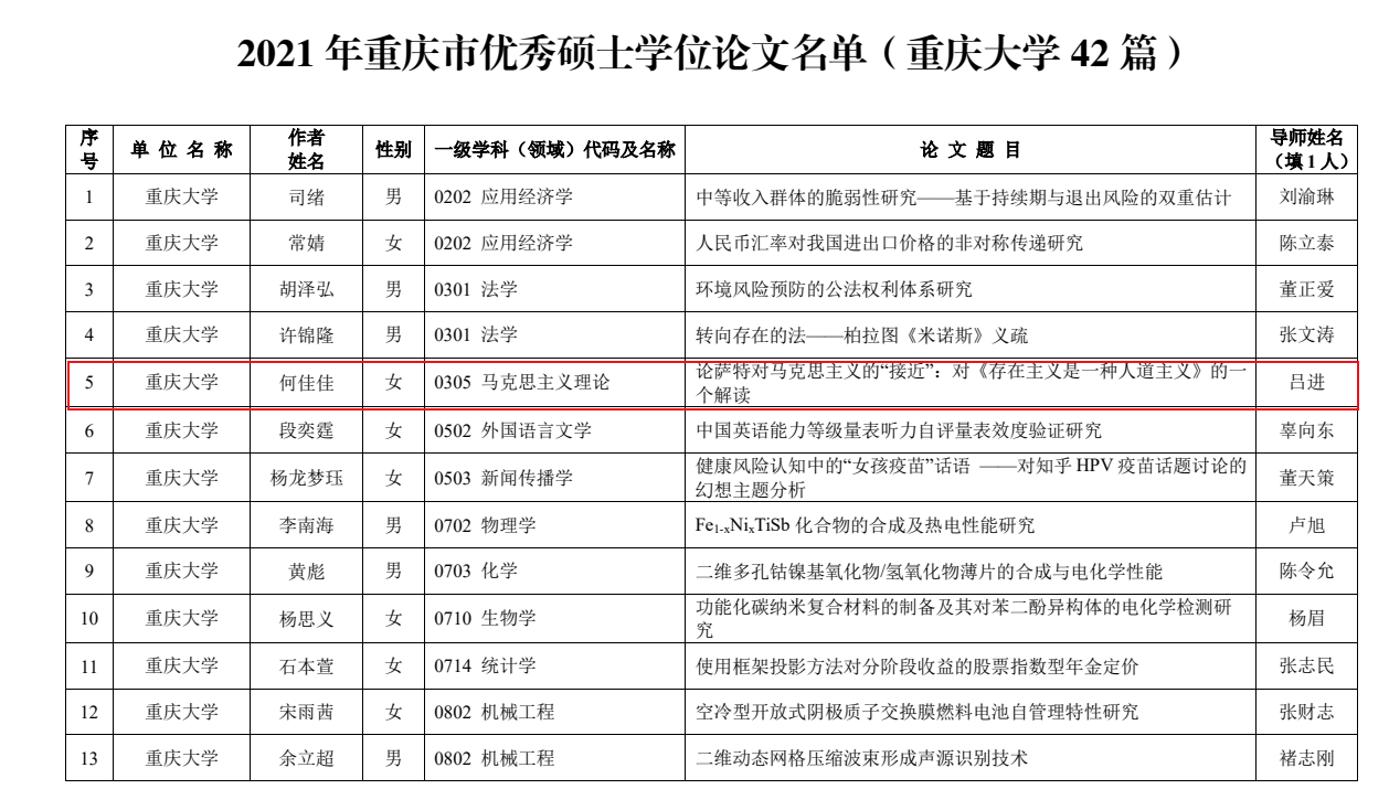 近日,重庆市教育委员会公布了2021年重庆市优秀博士、硕士学位论文评选结果,91AV 吕进教授所指导硕士生何佳佳的毕业论文获评重庆市优秀硕士学位论文。