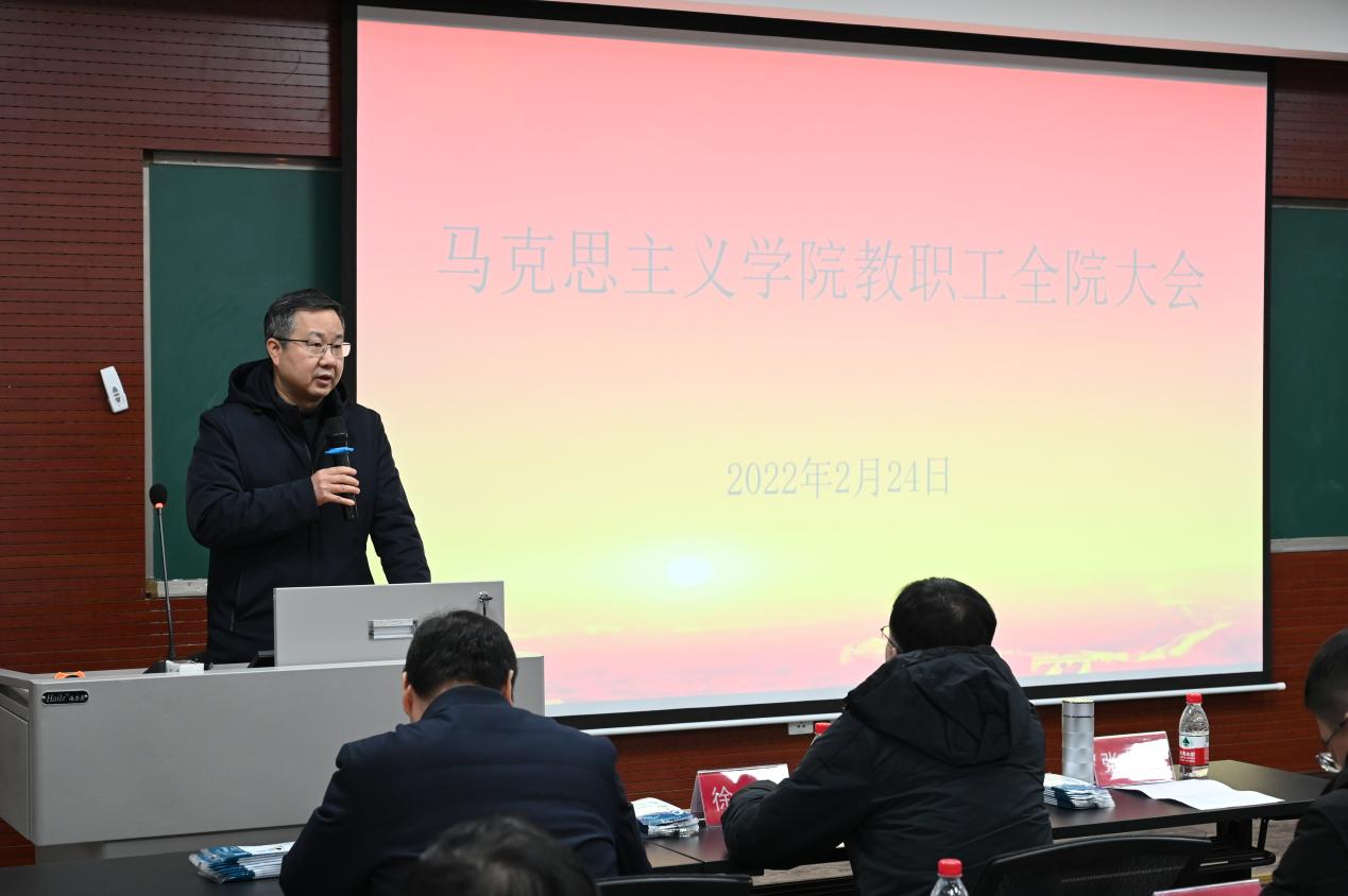 在406教室召开2022年第一次全院教职工大会,学院领导班子及全体教职工参会,会议由党委书记罗滌主持。