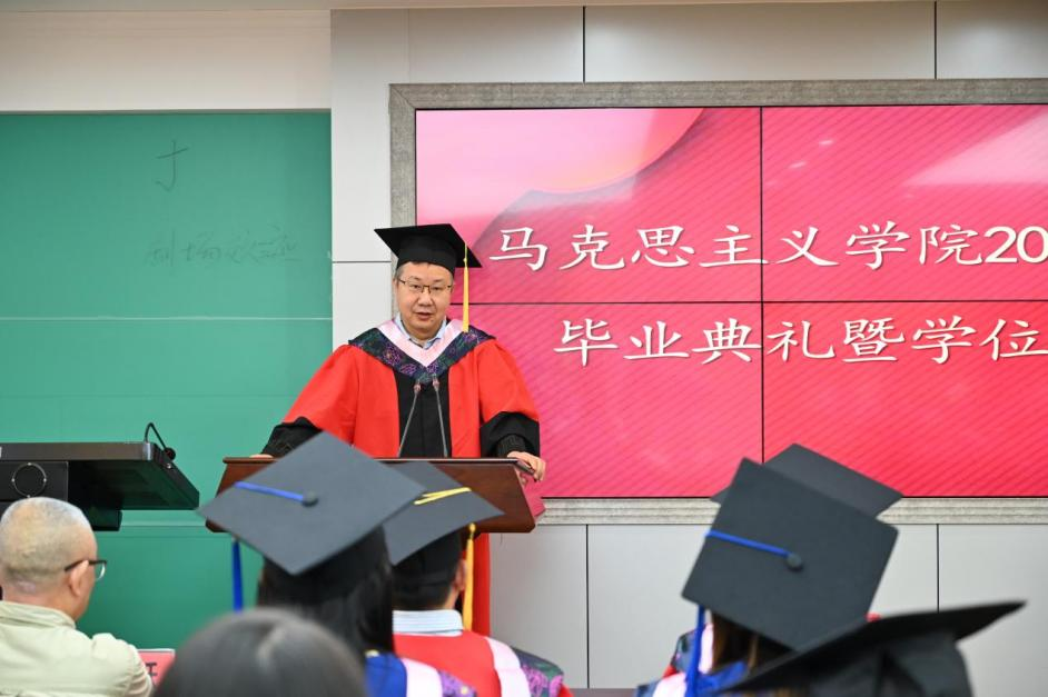 张邦辉在讲话中首先祝贺大家顺利毕业。他表示作为一名硕士毕业生,要时刻清晰自己的定位,在工作岗位上,应当从问题入手,在发现问题和解决问题中养成建设性思维,提高解决问题的能力,提出具有建设性的解决方案,运用历史观与大局观应对未来的各种挑战。张院长鼓励大家要培养虚心、谦和的人生态度,走上新的岗位要放低姿态、收敛锋芒,人生需要海纳百川的胸襟,虚心的人才能博取众家所长。同时,张院长对各位毕业生提出了希望,他希望希望同学们牢记“尚简朴、耐劳苦、勤学业、爱国家”的校训,立大志、明大德、成大才、担大任,成为对社会、对国家有贡献的人。最后,他祝愿各位毕业生展翅高飞,在以后的人生道路上可以行稳致远。