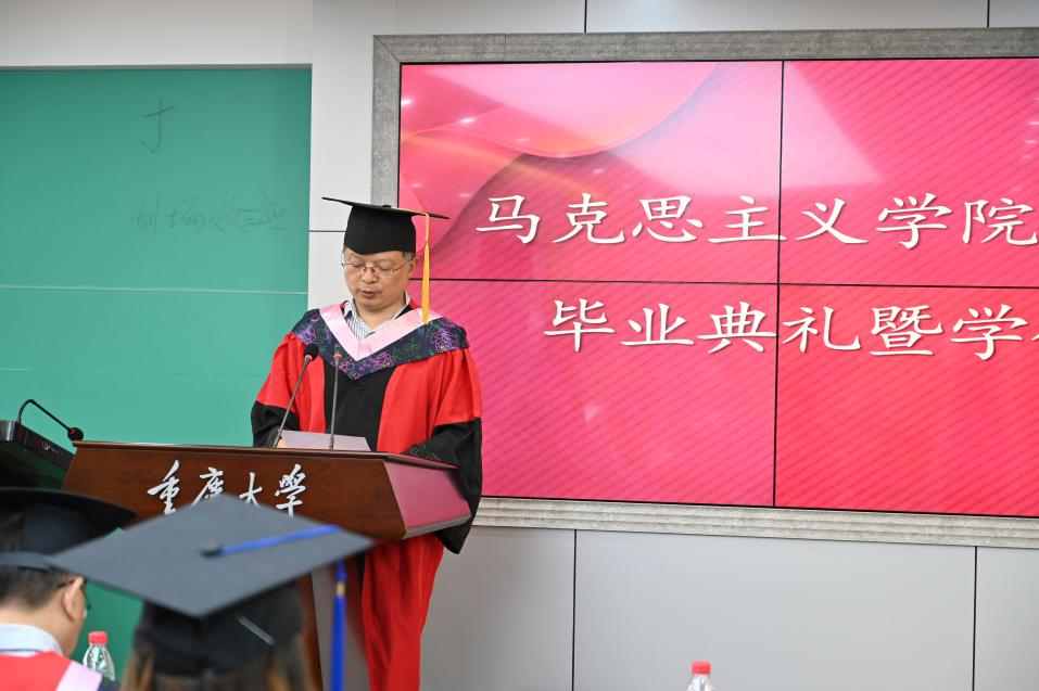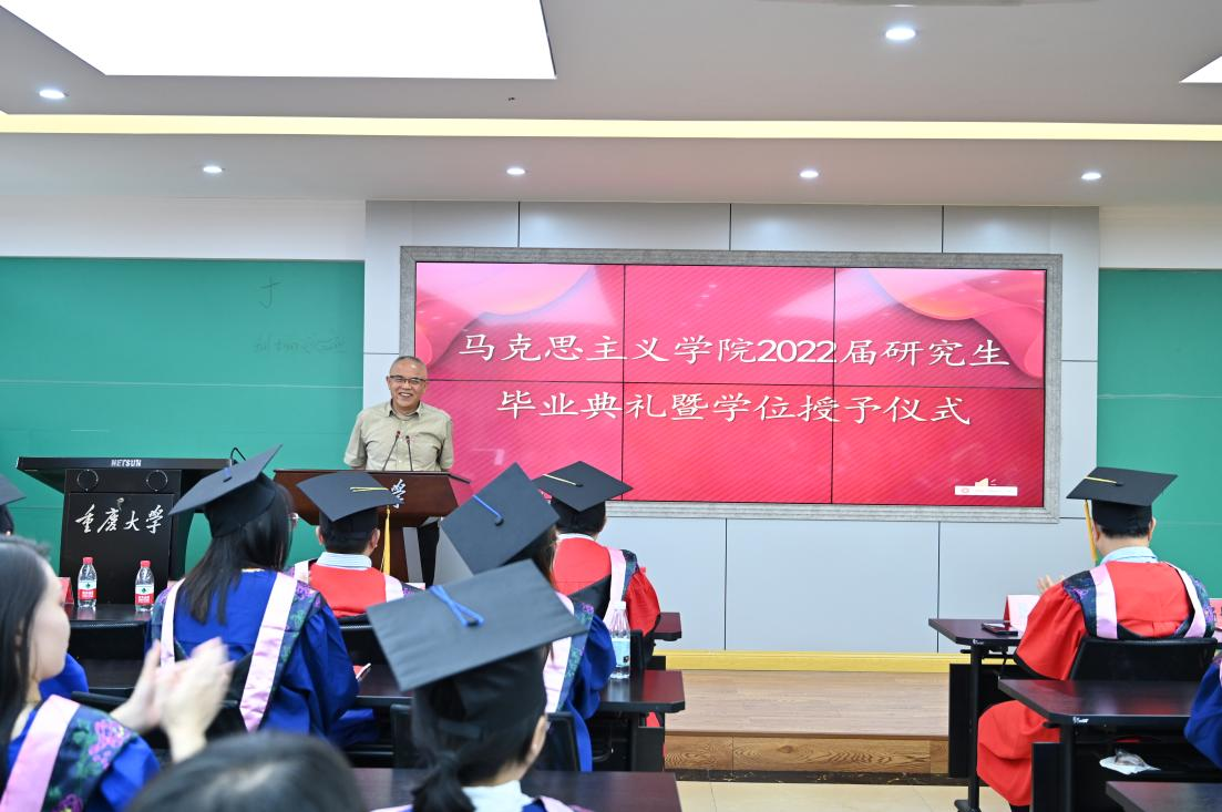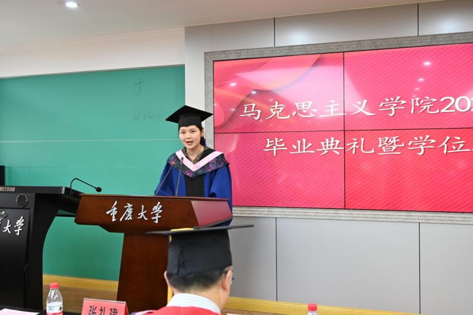 的培养,感谢学院老师们的谆谆教导。她讲到:“因为你们的辛勤付出我们才有了一段珍贵的校院时光,我们在这里成长,尽展风华正茂、挥斥方遒的书生意气,作为一名重大马院毕业生,无论我们身在何方,有着怎样的际遇,我们都会谨记老师给我们的深刻启发和教诲。今天我们以重大马院为自豪,明天重大马院将以我们为骄傲!”