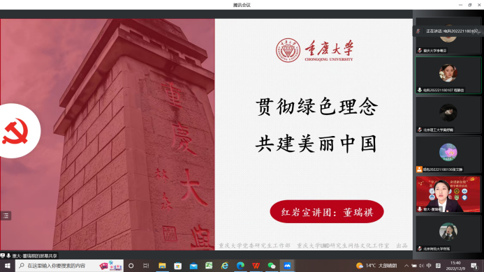 等10所高校联合举办,会议通过“腾讯会议”线上开展,电子科技大学硕士研究生程静宜主持,来自全国各高校140余名师生参会。我院红岩宣讲团成员董瑞祺作了题为《贯彻绿色理念 共建美丽中国》的主题宣讲。