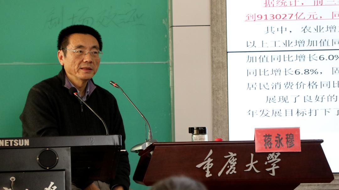 于学院楼408室举办“红岩讲坛”第四十一讲,特邀四川大学经济学院院长蒋永穆教授作题为“中国经济发展整体态势:怎么看?怎么办?”的学术讲座,我院党委书记陈科、副院长徐鲲、吕进及学院部分师生参加讲座。