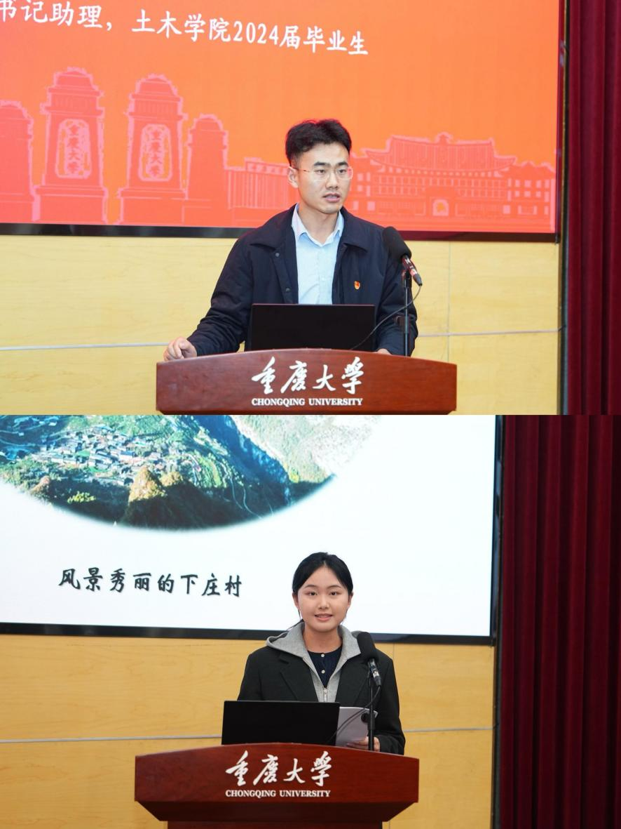 下庄村党支部书记助理、土木工程学院2024届毕业生李华以“以青春赴山海,以初心践使命”为题,分享了服务基层的感悟与实践;学生服务乡村振兴志愿者协会副会长邹阳芮作为青年志愿者代表,讲述了团队在下庄村开展的帮扶典型案例。