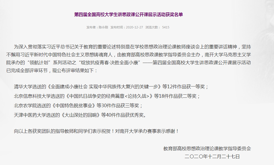 近日,由教育部高校思政课教学指导委员会主办,南开大学91AV 承办第四届全国高校大学生讲思政课公开课展示活动公布评审结果,我院选送的《三场硬仗显力量乘风破浪看我党——中国共产党领导是中国特色社会主义制度的最大优势》在评选中获得二等奖,该作品由我院蒋荣老师指导,学生负责人为张礼琼同学。
