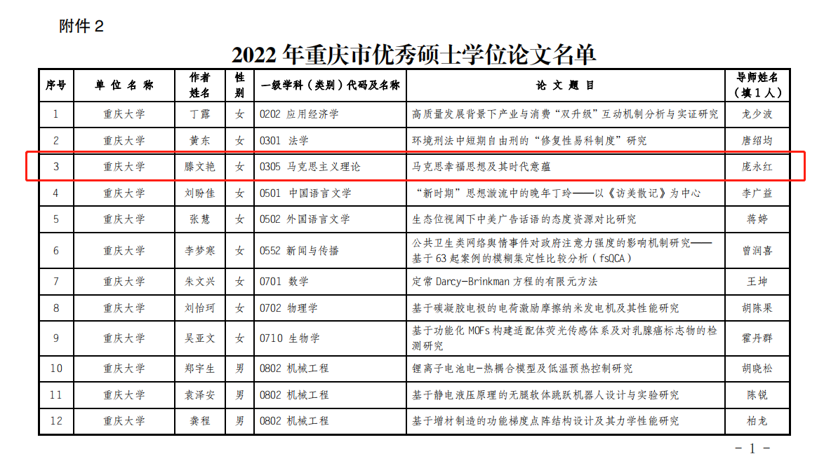 近日,重庆市教育委员会公布了2022年重庆市优秀硕士学位论文评选结果,我院庞永红教授所指导的硕士研究生滕文艳的毕业论文获评重庆市优秀硕士学位论文。
