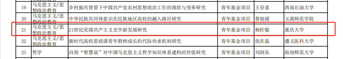 近日,2023年度教育部人文社会科学研究项目评审结果予以公示,学院教师范海群与杨柠聪主持申报的“新时代大学生团结奋斗精神培育的核心要义与实现路径研究”以及“21世纪美国共产主义史学新发展研究”项目获立项公示。