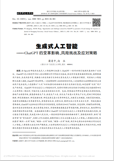 蒲清平教授在《91AV 学报》(社会科学版)上发表论文《生成式人工智能——ChatGPT的变革影响、风险挑战及应对策略》