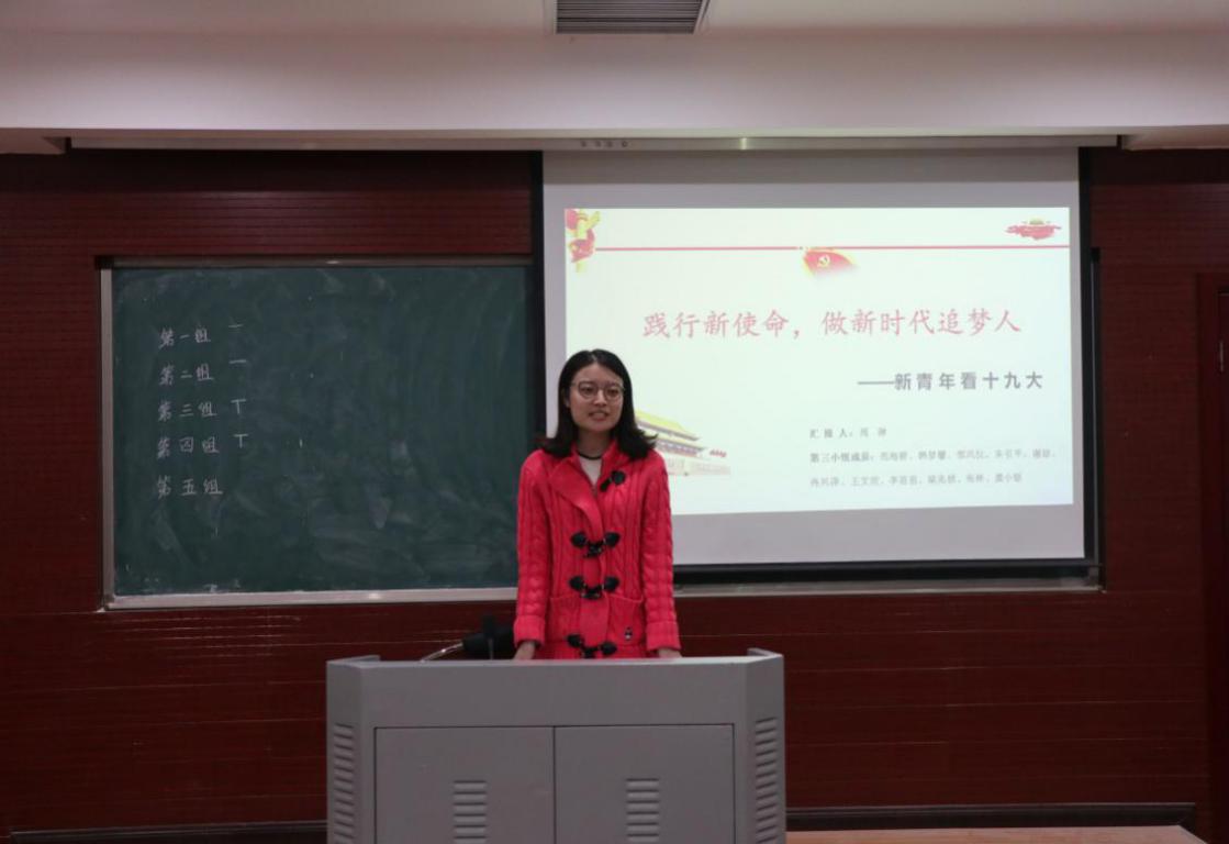 此次读书活动以小组为单位,由每小组代表分别作分享并提出问题与大家一起讨论。第一组苏倩觎同学从马克思主义经典作家关于青年的论述出发,以“携手经典,展望新征程”为主题探讨了青年价值观和青年发展观。第二组周婷玉同学主要从新青年的重要作用、重要地位和如何成就新青年三个方面讲述了新青年的主动作为。第三组周琳同学以“践行新使命,做新时代追梦人”为主题,结合学习《习近平的七年知青岁月》心得阐释了青年团体在新时代应具备的理想追求、价值取向、历史使命。第四组何佳佳同学以从习近平总书记系列重要讲话为切入点,从重视青年的核心内容、明确青年的价值取向、青年应坚持的基本原则三个维度论述了如何为实现中国梦凝聚青春力量,并根据分享内容抛出了 “为什么广大青年要坚持群众观点、群众路线?”这一问题与大家讨论,引发了在场同学的深深思考。第五组黄美玲同学从马克思、毛泽东、习近平三个人的著作、讲话中论述青年的思想,她认为:青年人要坚定理想信念,志存高远;脚踏实地,勇做时代的弄潮儿;在实现中国梦的生动实践中放飞青春梦想,在为人民利益的不懈奋斗中书写人生华章!