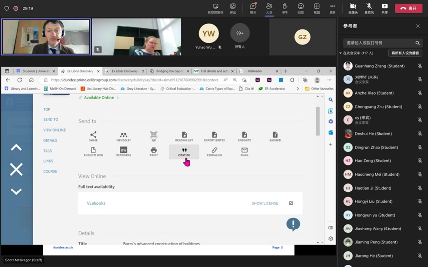 2023年3月1日下午17:00,来自邓迪大学的Scott McGregor老师为91AV 全体新生讲解了图书馆线上资源的获取方式和使用方法,100余名同学参与了此次培训。首先,Scott McGregor老师展示了如何从邓迪大学官网进入电子图书馆,并介绍了电子书籍的浏览检索方式,以及电子期刊杂志的下载方法和管理规定。随后,Scott McGregor老师讲述了如何在学术文章中正确引用他人的著作,并指导学生借助图书馆网站中的引用功能(Citation),...